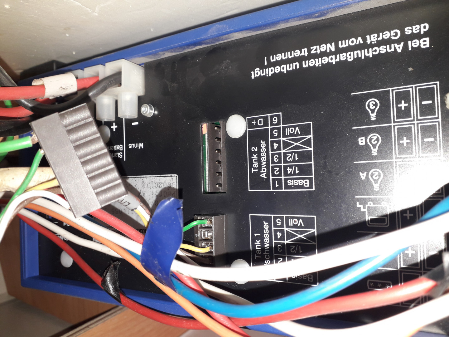Boksin takana oli katkennut "Tank 2" pinnistä 6 johto (D+). Johto kiinni ja 20 cm lisäpätkät irrotettuihin johtoihin (ettei tarvi mahdollisella seuraavalla kerrallan taas irroitelle niitä), sitten moottori käyntiin. Asuinosan virta 14 V.