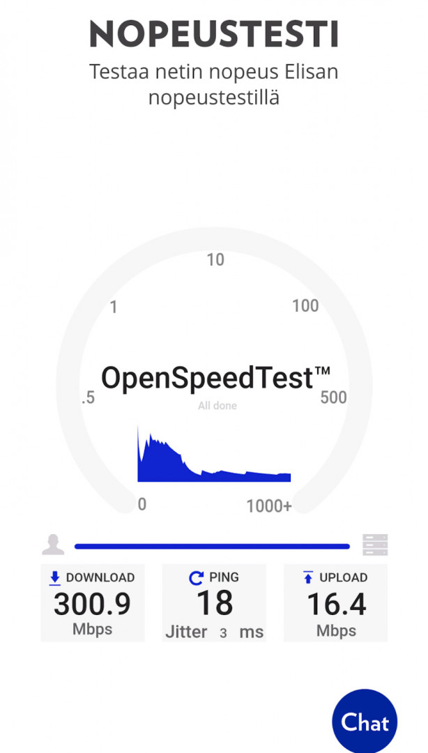 Juuri äsken mittasin Elisan testillä.  Lähetys 9,6 Mbps vastaanotto 10,8 Mbps.