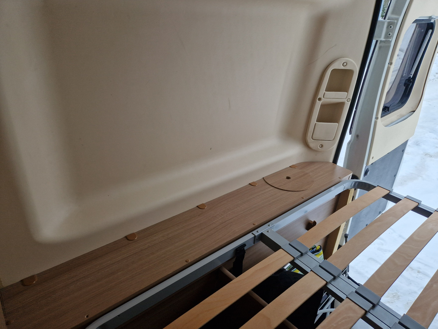 Retkeilyauto, poikittainen parivuode takana. Patja on kaksiosainen, päätypalan alla on pienempi pala jonka saa nostettua pois - alla on vesitankki. Juuri tässä päätypalassa on niitä homepilkkuja. Niitä juuri toista iltaa koitan saada pois etikalla, sitruunamehulla ja ruokasoodalla. Ei tunnu et vielä olisi edes vähentyneet.
