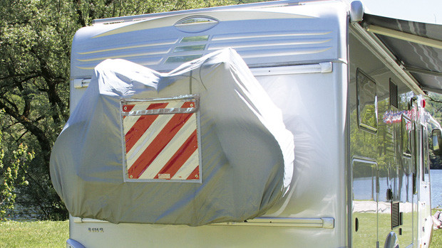 Käsittääkseni metrin ylityksen jälkeen tuollainen kilpi tarvittaisiin. Kuitenkin sellaisia kilpiä olen nähnyt matkailuautoissa, joissa on vain kaksikin pyörää. Omassani on nyt kahden pyörän teline ja puolen metrin takaylitys. Erillinen rekkarikilpi ja valot on.