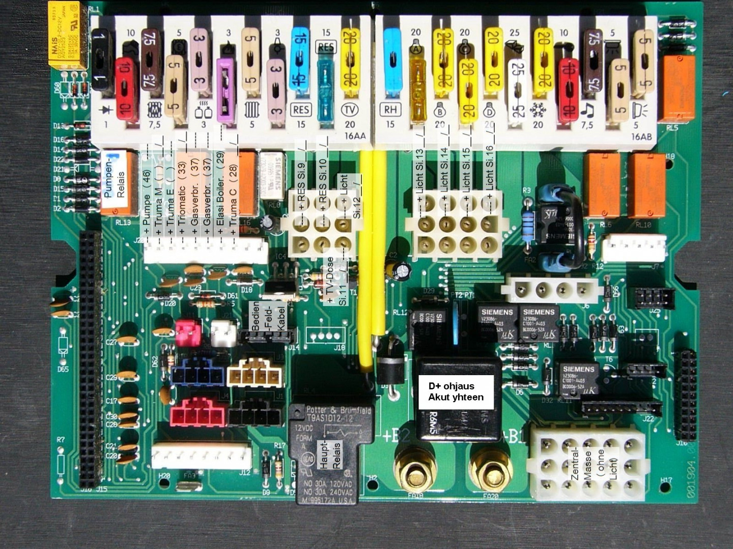 Nyt kun alan päästä jyvälle mistä D+ etsiä, niin löysin ihan auton dokumenteista kuvauksen piirilevystä. Liitteenä.