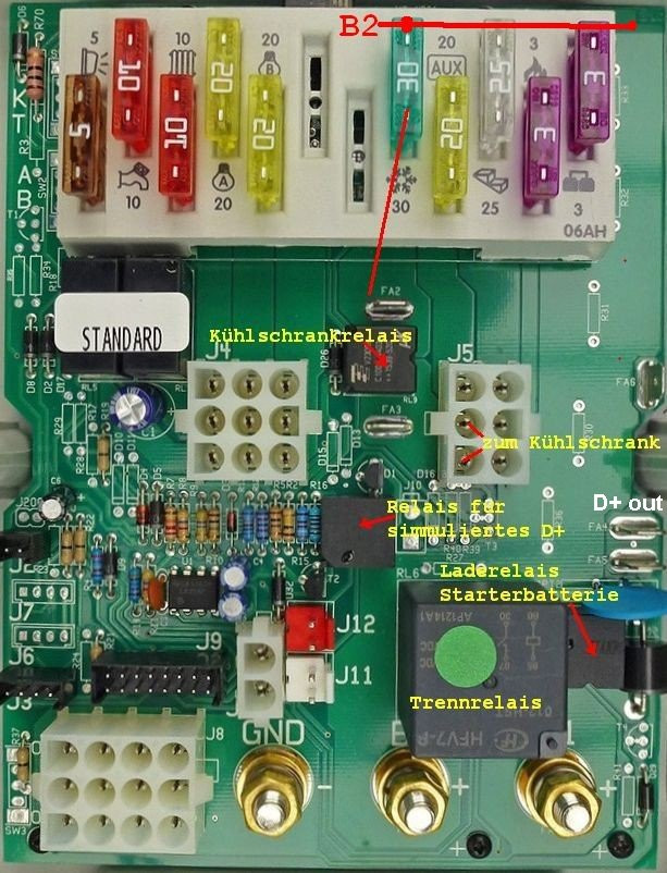 Tuolta löytyy rele joka kytkee akut yhteen. Löytyykö laitteelta D+? En muista mihin liittimeen D+ tuli, mutta seuraa juovaa releen käämistä. Ota molempien CBE-poksien kansi pois ja kuvaa piirilevyt niin nähdään mikä tyyppi on kysymyksessä. Releohjaus voi olla myös tuossa pienenmässä.