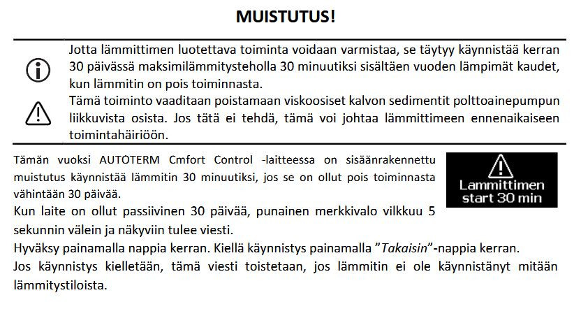 Retkipakussa on nyt Webaston lisäksi ilma Planar. Sen näyttöön tulee kuukauden käyttämättömän ajan jälkeen pyyntö käynnistää lämmitin puolen tunnin ajaksi. Kai siihenkin on syynsä. Maahantuoja sanoi sen lähinnä suojaavan polttoainepumppua ryytymiseltä.