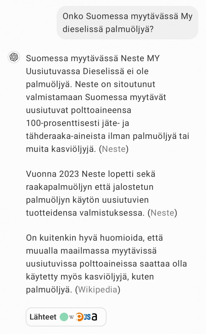 Mitä muuten mahtaa maksaa MyDiesel Baltiassa? Onko hintaero dieseleiden välillä sama, kuin Suomessa? Seuraako se sielläkin raakaöljyn ja muiden polttoaineiden hintoja? Ainekoostumus ei välttämättä ole sama Baltiassa. Hyvinkin voi olla, että biojätettä "jatketaan" palmuöljyllä. Neste ei kerro palmuöljytisleen määrää ulkomailla myytävistä. Saattaahan olla, että tuote valmistetaan Hollannin jalostamolla.
