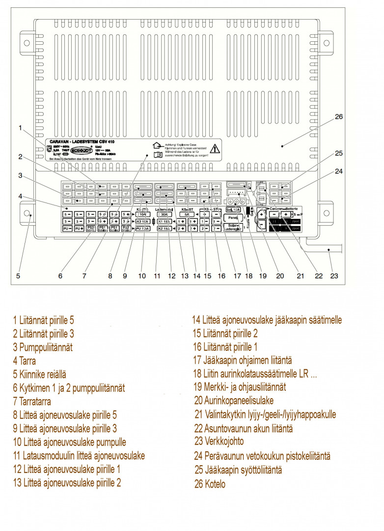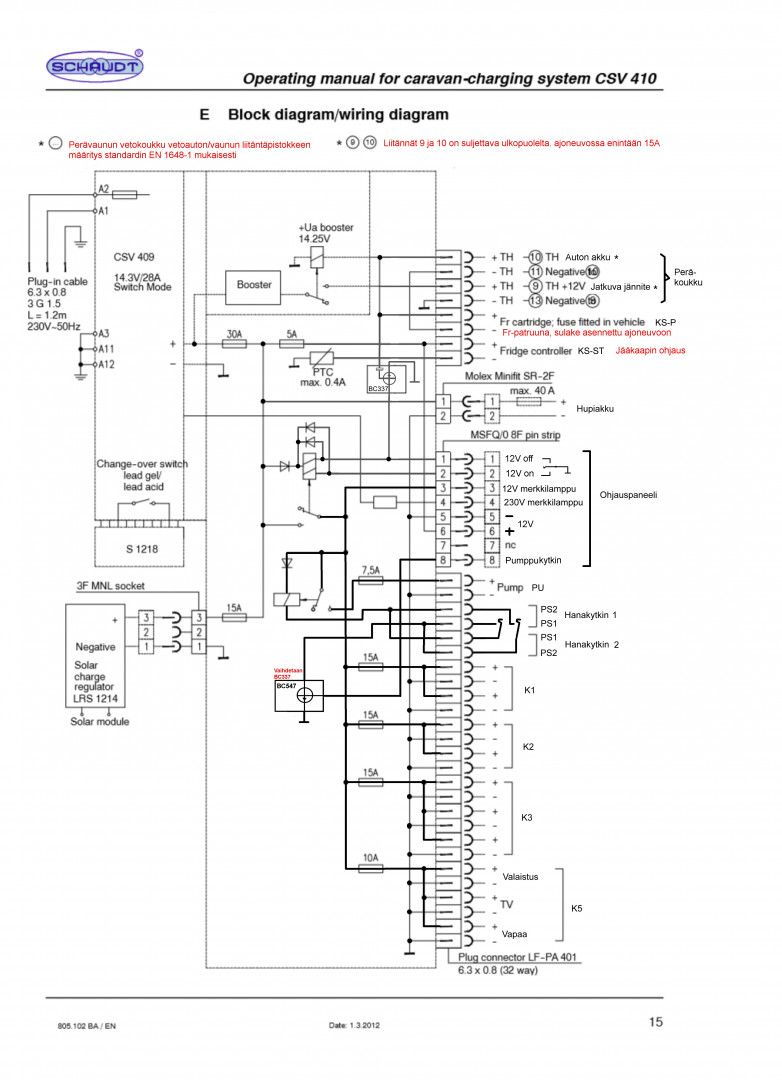 " Kopio viestistä"Please see the wiring diagram in the attachment for you. The best is to measure where the heater is connected to. Some outputs will be switched off when the car is there and the caravan is on the road for safety reasons. When this is a gas heater, it may not be allowed to use when the vehicle is on on the road.