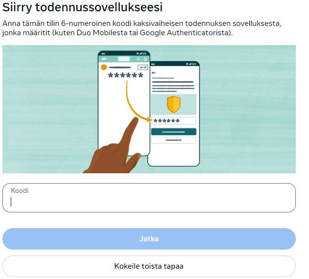 Nyt on koitettu ottaa yhteyttä Facebookiin ja annettu henkilötiedot. Joku kirjautumiskoodi tuli, mutta ei sillä pääse eteenpäin, kun homma tyssää siihen 6-numeroiseen koodiin 2-vaiheisessa tunnistuksessa. Minulla kun sellaista koodia ei ole, enkä tiedä, mistä sen saisin. Mahtaako tuolla Facessa olla muuta, kuin joku tekoäly vastaamassa?
