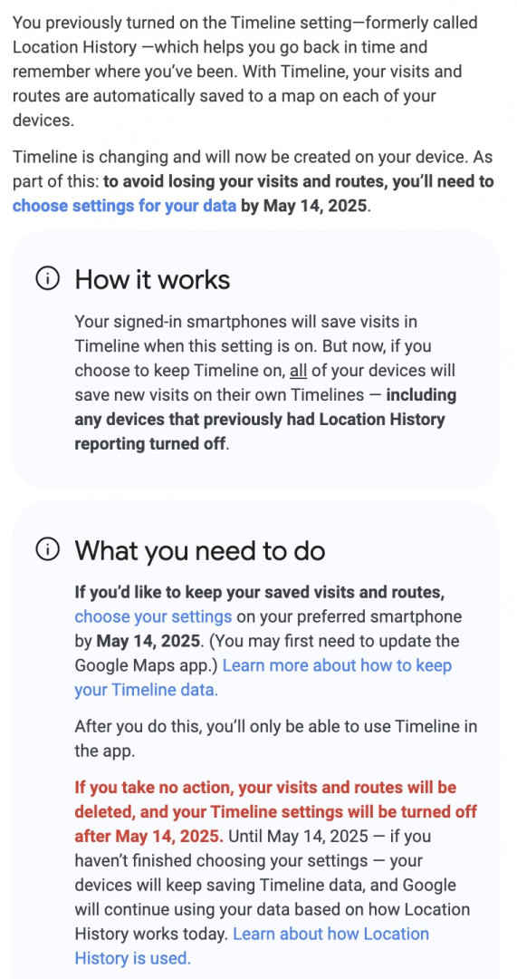 Sitten kun kuvatkin (kännystä) tallettaa samaan pilven (Drive), niin yhdistelee paikat, kuvat, matkat jne kyselemättä.. Maps Timeline oli hyvä, mutta nykyään lähes käyttökelvoton ja 14.5.2025 katoaa myös kaikki Timeline data, ellei valitse asetuksissa että haluaa jatkaa käyttöä ei poisteta tietoja automaattisesti. Tämän jälkeen reitit ei tallennu enää pilveen, vaan kuhunkin laitteeseen paikallisesti erikseen ja tietskalla ei Timeline pysty tarkastelemaan enää lainkaan, ainostaan sillä tallentaneella laitteella voi tarkastella reittejä. Näin kehitys kehittyy.