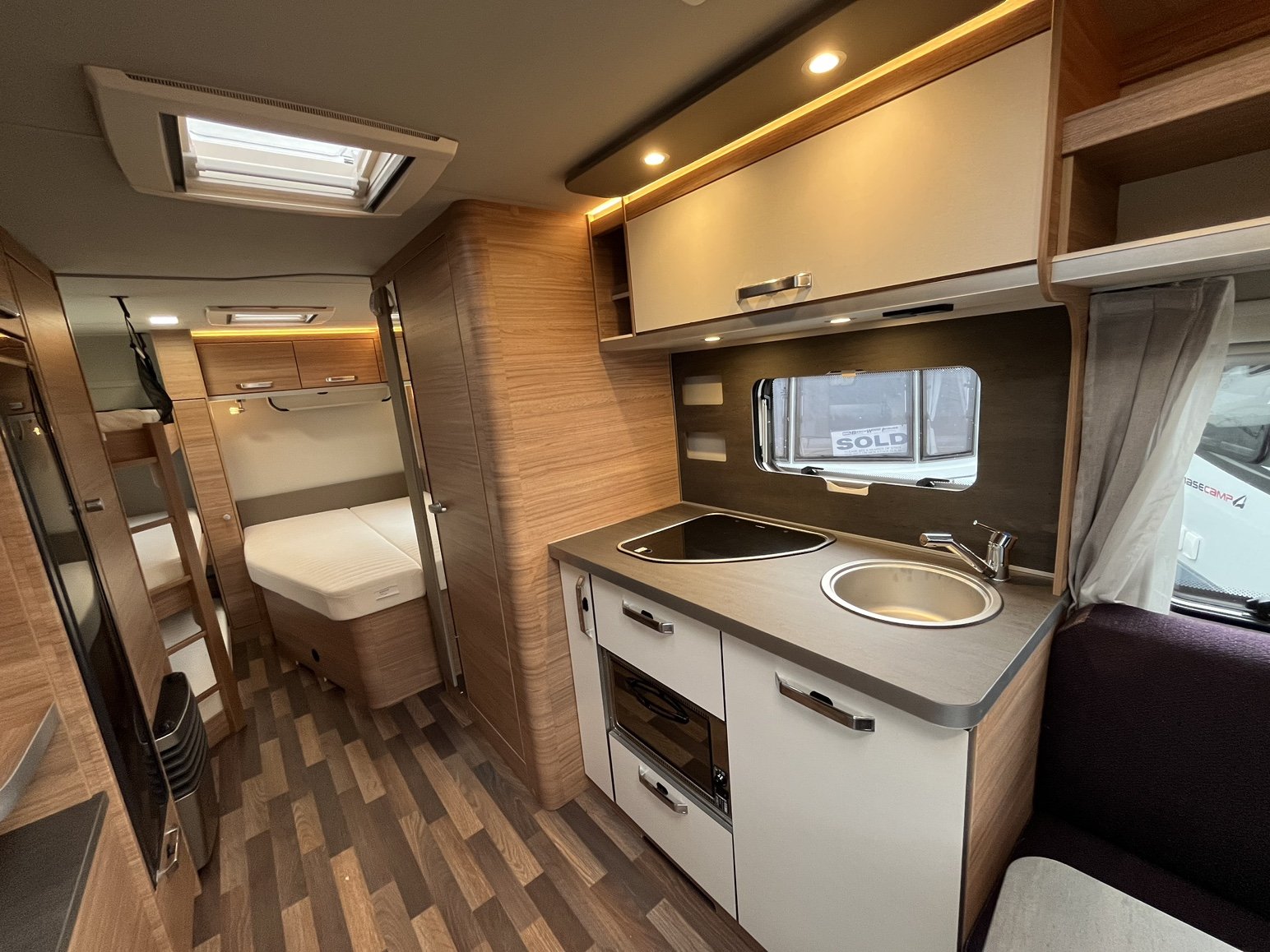 No tuota meidän Berlingoa kyllä saisi 7-paikkaisenakin (siis nimenomaan 7 aikuisen, ei mikään 5+2 lapsiversio), mutta se tulee vetomassojen kustannuksella, jolloin tuota vaunua ei enää saisi sillä nyppiä lainkaan. Je mekin mamman kanssa vain kahdestaan muutenkin reissataan, niin tuolla vaunussa on nyt siis 5 nukkumapaikka jatkuvasti "liikaa", mutta tuolla 2>3 krs.sänkymuutoksell a me saatiin se yksi peti lattiatasoon ja siitä tuli koirien oma peti, jopa ihan omalla ikkunallaankin ulos. Nuo krs.sängyn 2 muuta tasoa toimii matkatavarahyllyinä, jonne on helppo nakata se matkalaukku ja levitellä siihen, kummallakin omansa, niin ei tartte kaappien kanssa alkaa nyhräämään. Ja väliverho vain kiinni, niin on "makuuhuone" poissa mahd. vierailijoidenkin silmistä  Tämä kuva ei ole just meidän vaunusta, mutta saa käsityksen tuosta makuuhuoneesta. Meillä on ilmastointi tuossa katon keskiluukussa ja keittiön laatikostot pitkinä vetolaatikkoina, ilman uunia