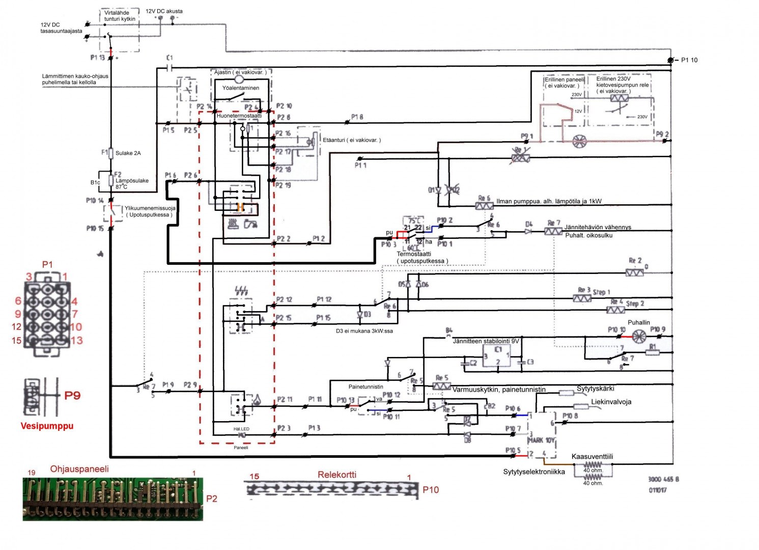 Toimenpiteet: - Vaihdoin ohjainkorttiin tuon mainuntun diodin , Relekorttiin releen (RE7) ja sit otin paloilmanpuhaltimen irti. Siipi tuntu pyörivan mukavasti, laitoin sinne vähän teflon rasvaa vielä, et pyöris paremmin. Puhaltimen käämin vastus oli muistaakseni 3.7ohm? Jossakin sanottiin et pitäs olla 4? Mittarivirhe, kyllä 3.7 on ok. - Laitoin johdot paikalleen ja aloin ihmetteleen et josko toimis ... Sähköllä lämmitys ainakin toimi ja pumput pyöri, mutta kaasulla ei.