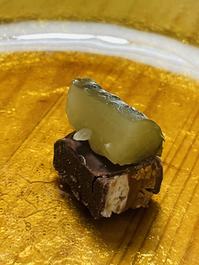 Yllätin itseni tällä makuyhdistelmällä. Alle pala Snickersiä ja päälle pala suolakurkkua. Ääntä kohden.