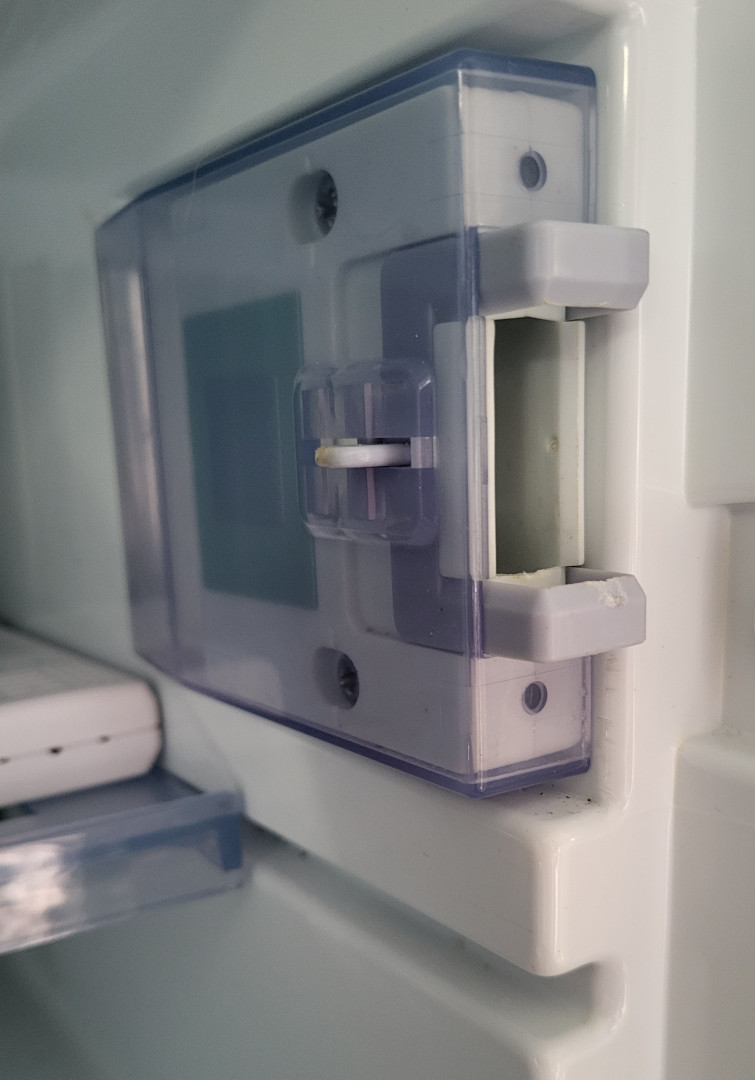Jääkaapin alaosassa on iso muovinen, ulosvedettävä lokero tai laatikko esim. vihanneksia varten. Siinä on siirrettävä tilanjakaja, sellainen muovilevy, joka pudotetaan laatikon reunassa oleviin uriin. Kun auto ei ole käytössä, otan sen tilanjakaja-levyn, raotan pakastelokeron luukkua ja sujautan sen muovilevyn sinne väliin. Pakastelokeron luukku jää raolleen. Ja kun pakastelokeron luukku jää pakotettuna raolleen ei myöskään ovi mene enää kiinni. Mun kaapissa on siis yksi ovi, ja pakastelokero siellä sisällä.