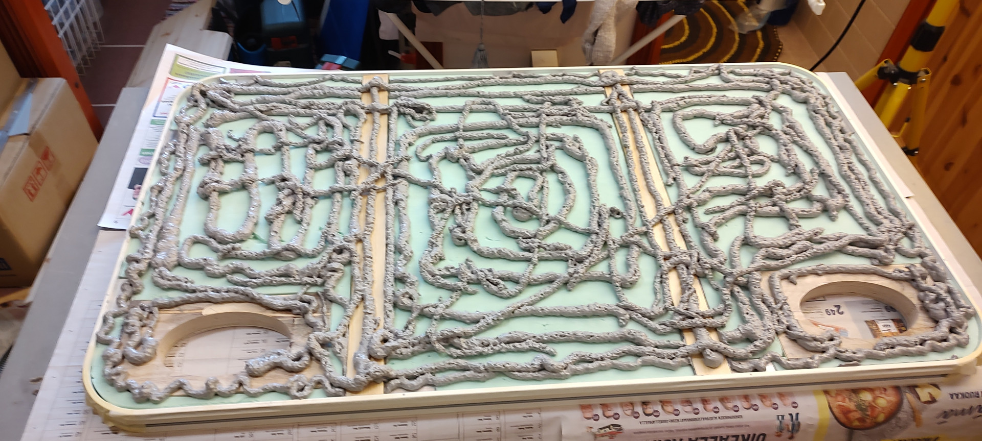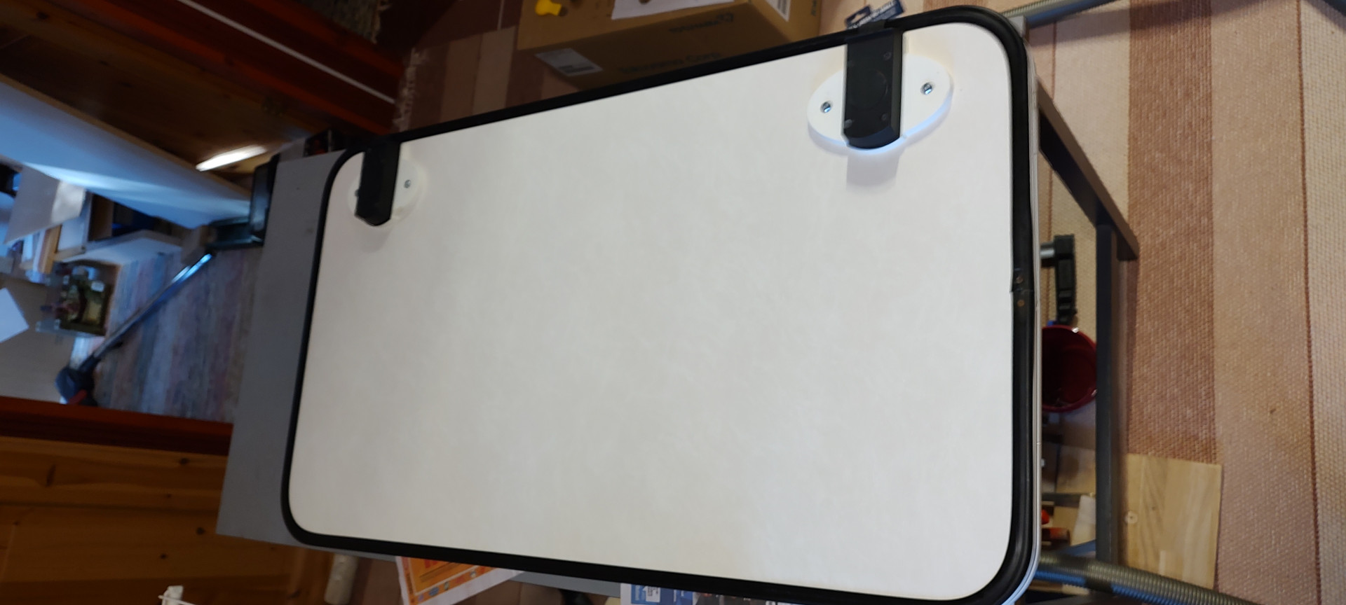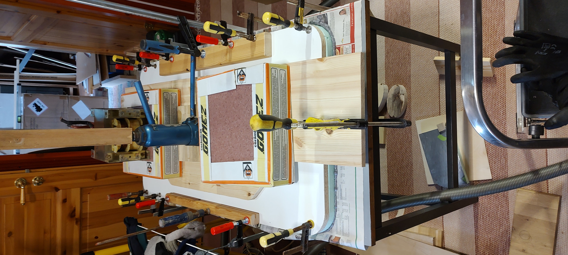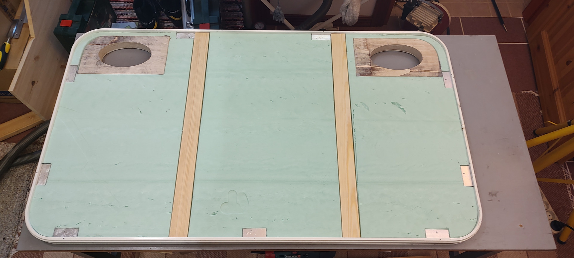 Paljon piti laittaa vaahtoliimaa kun sisäpuolen levyä liimasin kun ohensin hieman liikaa tuota 30mm:n uretaanilevyä, liimasaumasta piti tehdä 3mm paksu mutta siitä tuli hyvä, onpahan eristekerros puuosienkin kohdalla nyt.