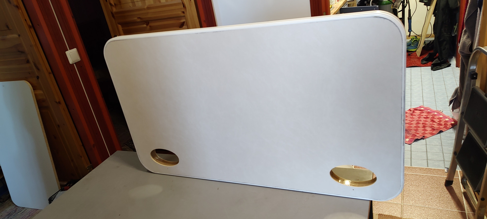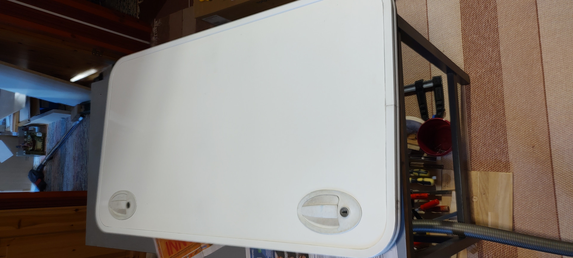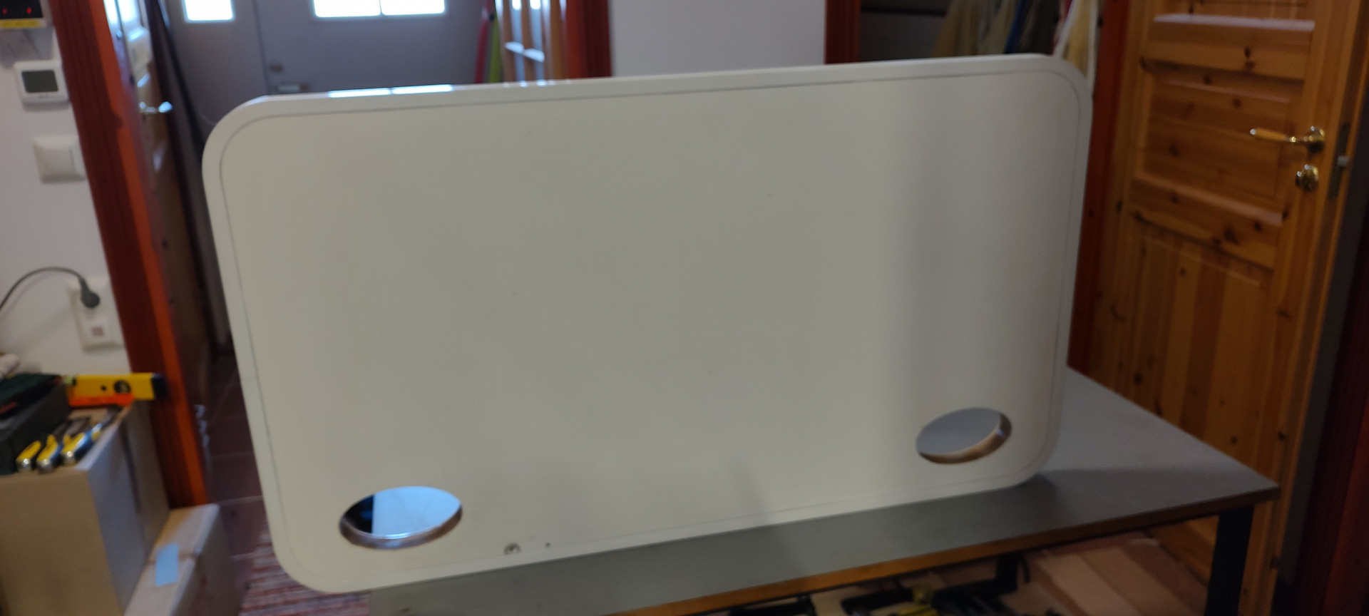 Jo 10v sitten huomasin että takatallin ja kaasupullokotelon ovet vettyneet huonon massauksen vuoksi, takatallin ovissa ilmeisesti lukkopesät keränneet kondensiovettä joka sitten imeytyi lukkopesän ympärysvaneriin ja sitten styroksiin ja lopulta alkoi vuotamaan oven kehyksen ja ulkolevyn saumasta kun sisukset ovesta pehmeni. Nyt sitten lopultakin ehdin tekemään ovet ja melkoinen työmaa kuitenkin onneksi sain vanhan purettua niin ettei vanhat kehykset, tiivisteet ja ulkopintalevy vaurioituneet.