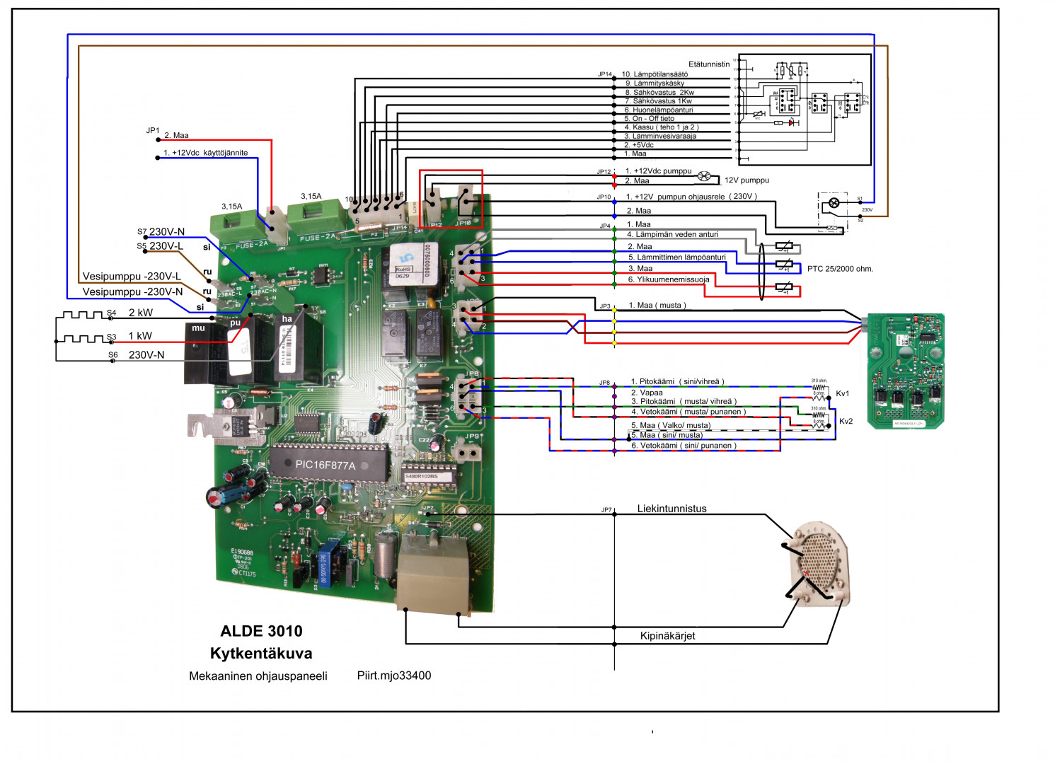 Meillä Alde 3010 oireilee vähän vastavasti. Vaikkei mekaanisesta ohjauspanelista ole edes kytketty lämmitystä päälle kioertoveripumppu lähtee pyörimään kun asuntoosaan kytkee virrat päälle. Ongelma alkoi kesällä niin että aluksi kaikki saattoi toimia vuorokauden normaalisti, mutta jonkun ajan päästä auton lämpö alkoi nousta ja silloin kiinnitin huomiota että kiertovesipumppu pyörii jatkuvasti. Viikonloppuna nykäisin irti 230V lähdön alden ohjauskortilta ja huomasin että sillä pumppu pysähtyi. Meillä on nuo molemmat 12/230 lähdöt kytketty samaan alden kyljessä olevaan kiertovesipumppuun. Osaako joku sanoa miksi niitä lähtöjä on 2 kpl ja miten ne toimivat? Minusta vaikutti nopealla testauksella että nyt lämmitys toimi kaasulla, mutta verkkovirta kytkettynä kiertovesipumppu ei lähtenyt enään pyörimään. Onko joku muu päässyt ihmettelemään vastaavaa, mikä noista ohjainkorteista yleensä menee rikki?