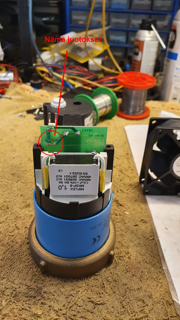 Tarkista pumpun 12 voltin ohjausliittimen juotokset, voi olla murtuneet, kunten kuvassa vinkataan. Toi alkuperäinen konkka on uutenakin hieman rajoilla, ei toimi enää kun kapasitanssi menee alle 0,5:n mikron.