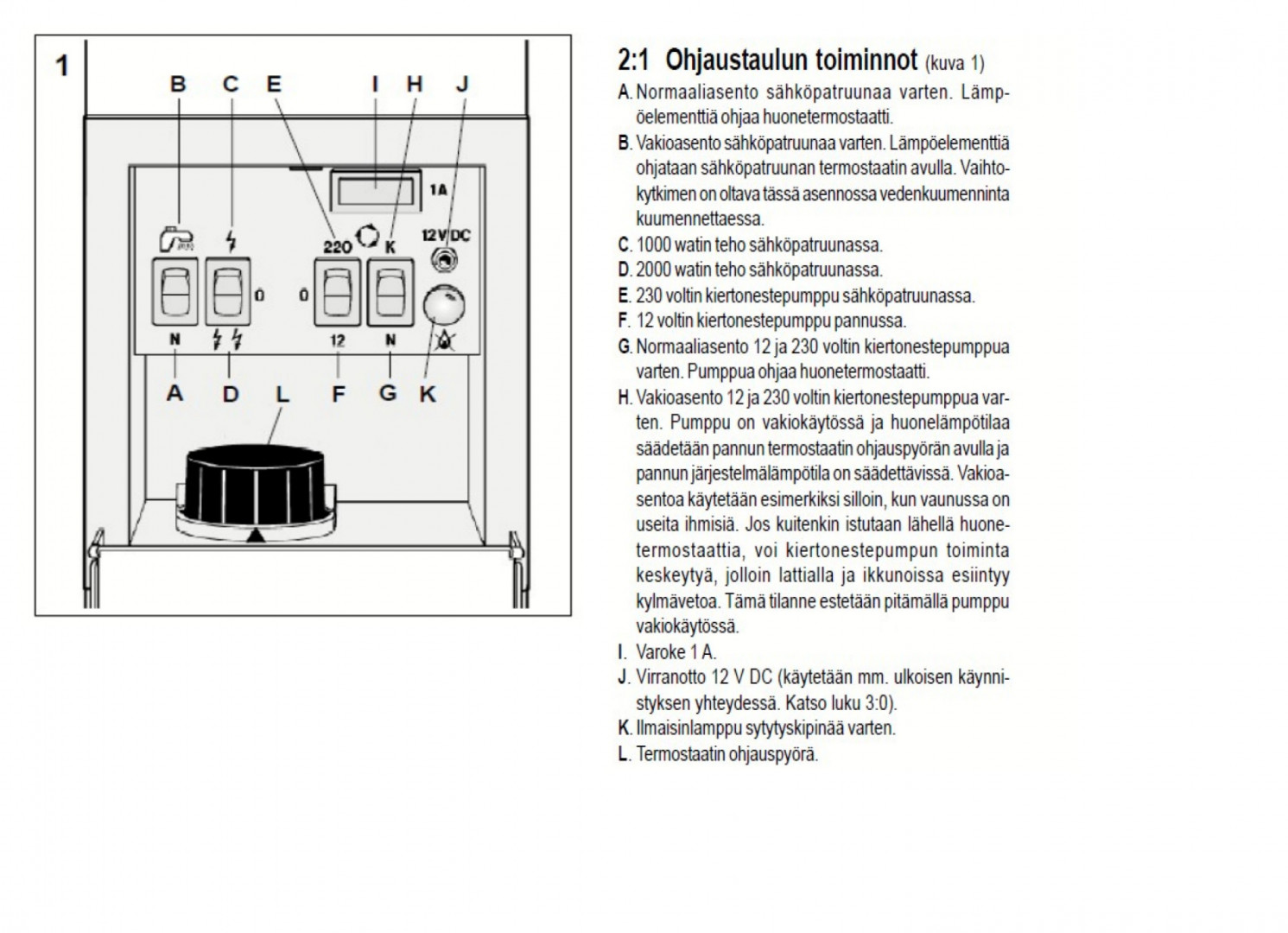 Enkunkieliset ohjeet olenkin jo löytänyt mutta tuokaan kuva ei kyllä vastaa kysymykseen että _koska_ tuo sähköpatruuna on päällä maasähköissä? Oletan että kun tuo 1/2KW -kytkin on keskiasennossa niin silloin se ei lämmitä.