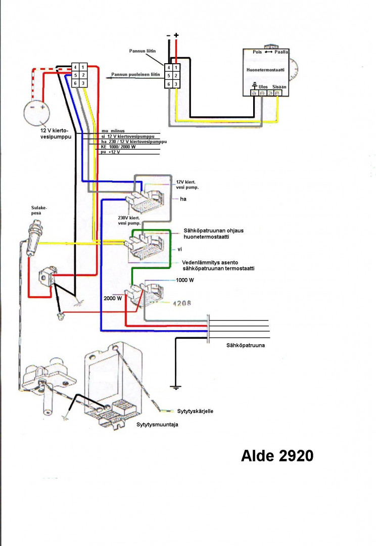 Vastasit omaan kysymykseen oikein. ;D Kiertovesipumppu pitää olla päällä, jos on Alde patruuna ja siinä erillinen ohjaus kytketty. Jos on kytketty 1kw: kanssa yhteen ei sitä pumpun ohjausta tarvitse laittaa.