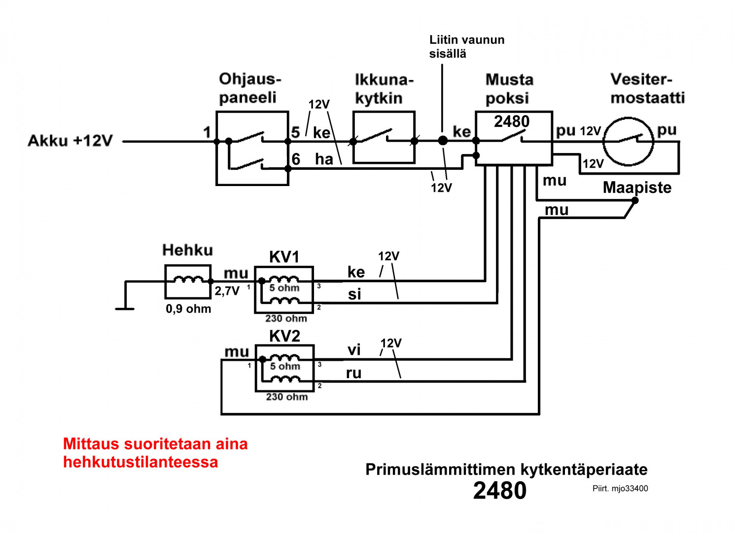 Ota 5:tos nastasta johto irti ja kytke se käsin ykköseen, lämmittimen pitäisi käynnistyä. Jos näin käy niin ohjauspaneeli rele pitää vaihtaa. Rele k2. Voit myös kokeilla siten, että otat nastan 6 johdon irti ja kytket nastan viis johdon siihen