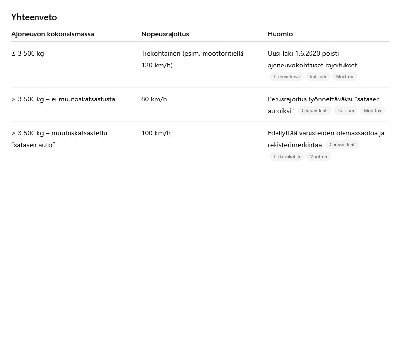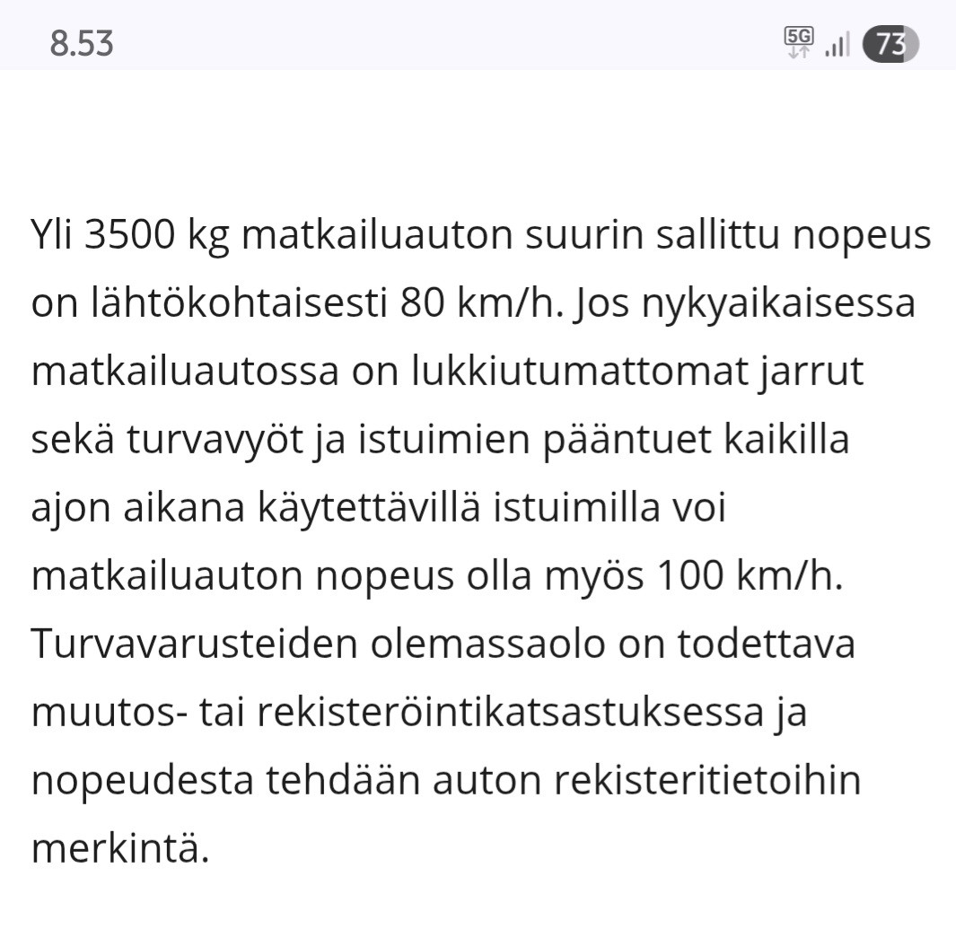 Tuossa yli 3,5-tonnisen 100km/h luvassa kannattaa sitten olla tarkkana. Mulle kävi niin, että kun kävin muutoskatsastamassa omani 3,5t -> 4t, niin katsuri teki hommansa ja tulosti uuden otteen. Kotona rupesin sitä rekisteriotetta tarkemmin syynäämään ja ihmettelin kun en löytä merkintää 100km/h nopeudesta. Soitin lopulta katsastuskonttorill e ja kysyin missä se merkintä on kun en löydä. Kaivoivat sen muutoskatsastuksen tehneen katsurin puhelimeen ja se oli vähän nolona että "aijooniin, unohdin".