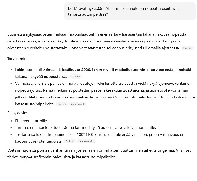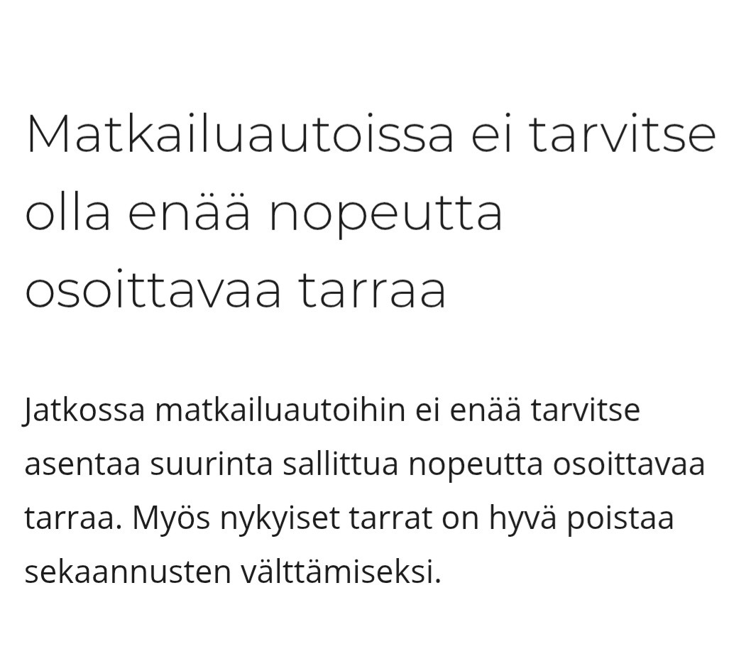 Tässä oikea tieto! Tekoälyhöpinät joutuavia.. Tarroja ei tartte olla minkään painoisissa m-autoissa lätkää (saa olla kuten Fränkissä sakun valkopohjainen 100 lapppu). Mutta jotta saisi Suonessa ajaa 100, niin otteessa pitää näissä raskaammissa olla maininta, tai muuten se on vain 80 (kuten ulkolaisilla). 3½tn tai alle, ei ajoneuvokohtaiata rajoitusta kotimaisella tai ulkolaisella - Suomen tieliikenteessä.