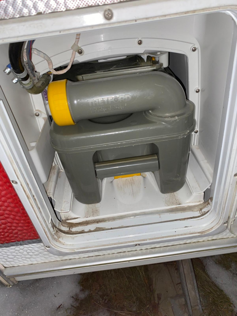- Ota apulainen ja toinen yrittää ulkoa huoltoluukun kautta rynkyttää sitä kasettia ja toinen kääntää sisältä vessan avausvipua, jos se jumi sattuisi avautumaan.