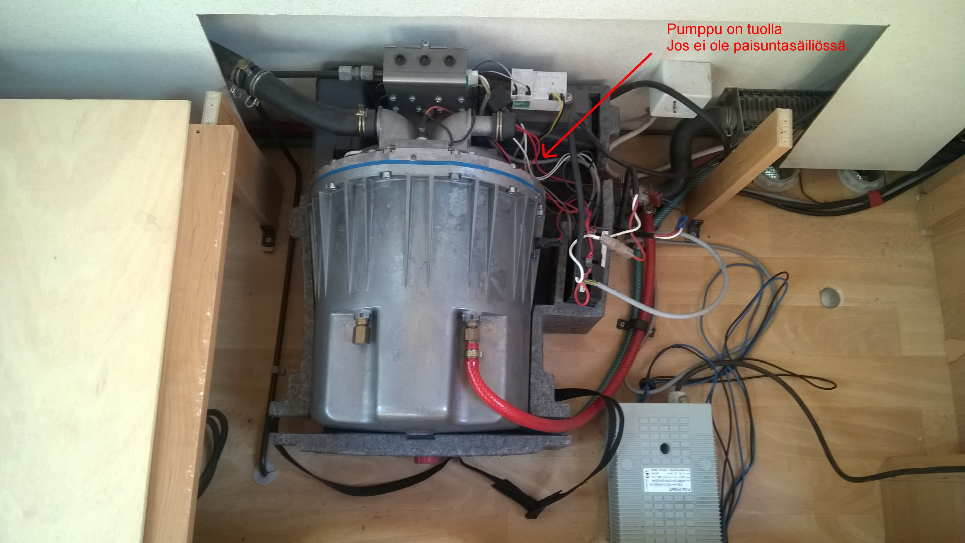 Kiitos vastauksesta. Mies oli jo löytänyt sen. Vaatekaapin alaosassa. On kaksi pumppua rinnakkain, joista toinen on rikki. Sijaitsee harmittavasti seinän ja lämmittimen välissä, joten joutuu irroittamaan lämmittimen ja päästämään nesteet pois. Koitetaan pärjätä yhdellä pumpulla ja korjata ilmojen lämmettyä.