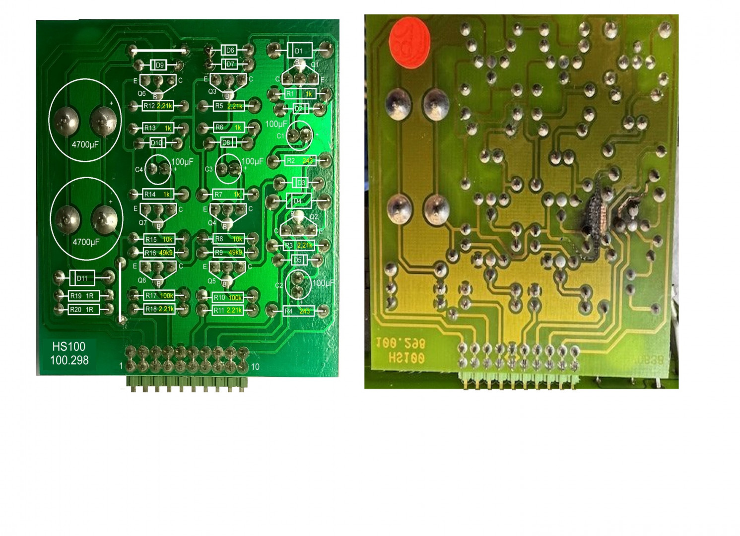 Diodit D3 ja D5 ovat oikosulussa, transistori Q2 on räjähtänyt ja rele RE1 on myös palanut.