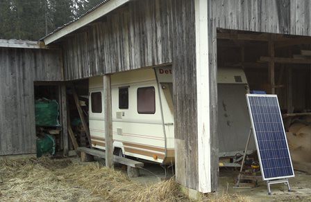 Pari kuukautta akut oli varattuna 99 % nyt taas täydet 100 %. Aurinkokenno on ollut tuossa katon alla, suunta lounas - länsi ja metsä varjostaa voimakkaasti. Ei tarvitse kantaa isommin huolta akuista, kunhan joskus käy haistelemassa vaunun sisäilmaa ja vilkaista säätimen näyttöä.