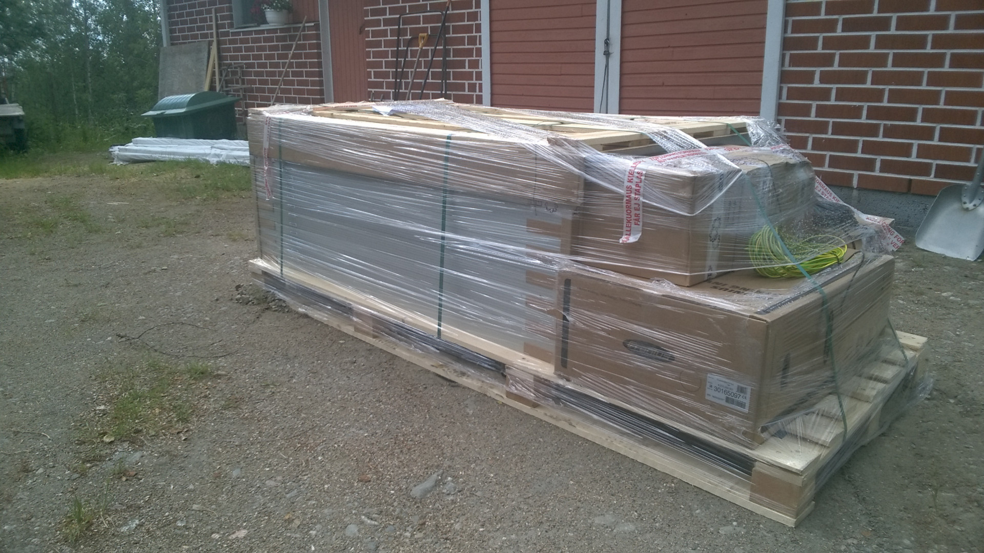 16 paneelia, invertteri ja tykötarpeet odottavat maanantaita ja asentajia.