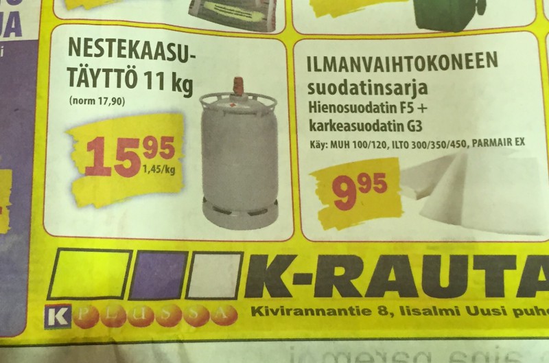 Jos on Juhannuksena Iisalmen ohiajoa ja kaasupullo tyhjä niin kannattaa poiketa hakemaan uusi K-Rauta Masasta, torstaihin asti pullo lähtee 13.95 €, normihinta muulloin 17.90 €