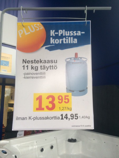 Rautaosalla Woikosken kaasu 17,90 € (todennäköisesti tarjoushinta liikkeen avajaisten kunniaksi, kysyn huomenna tarkemmin)