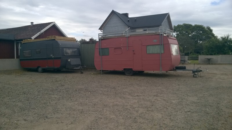 Pari vaunua terasseineen ja ainakin punaisessa oli kilpi