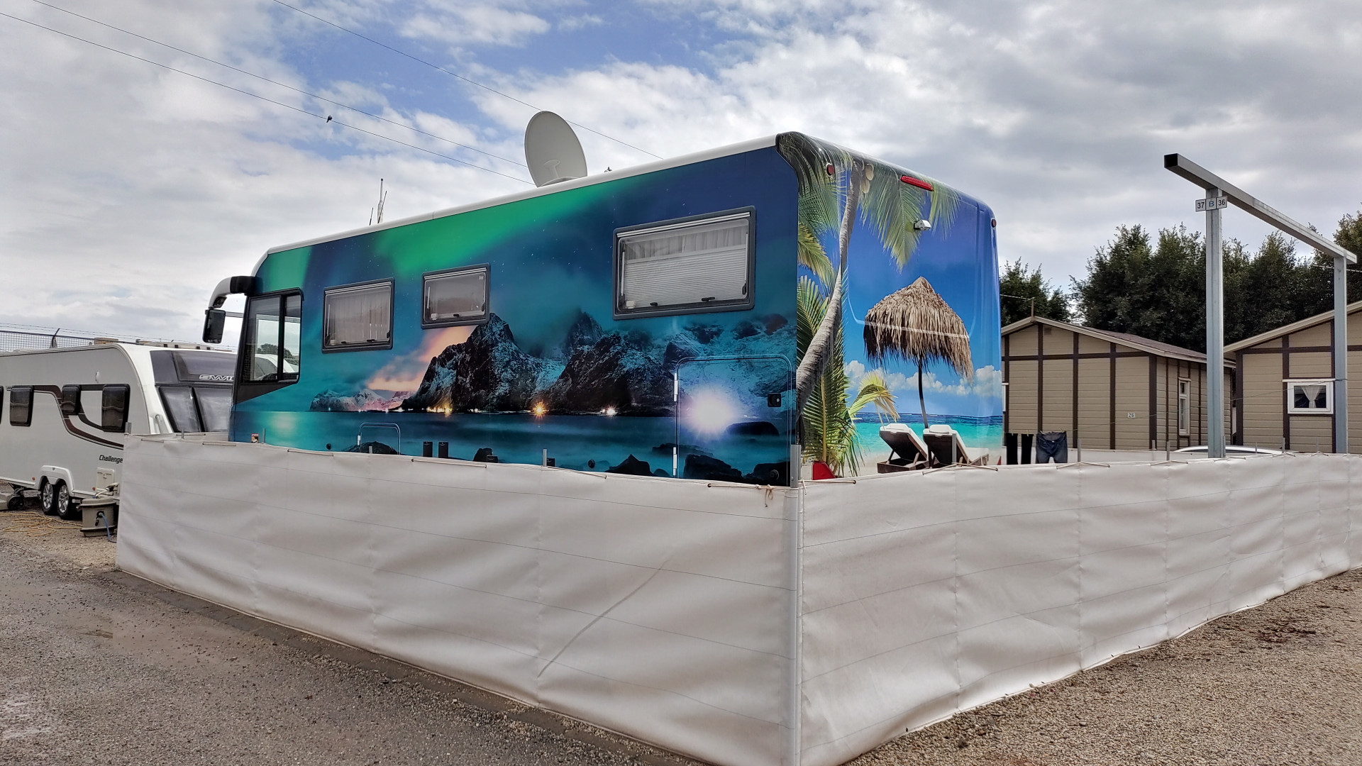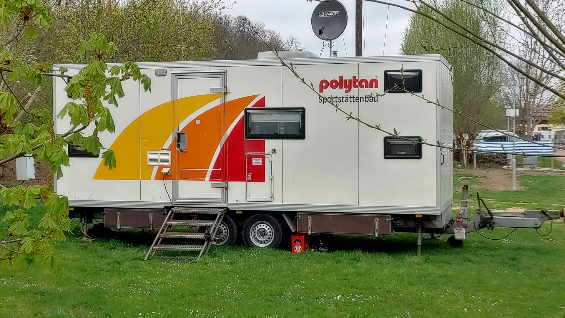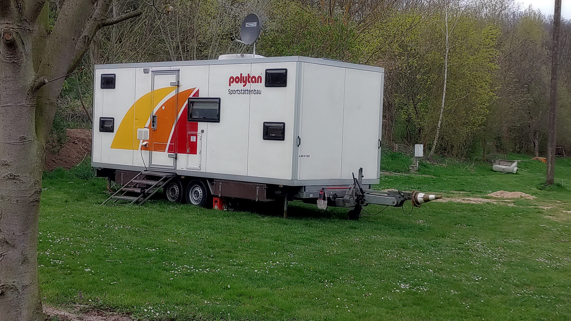 On työporukan yöpymisvaunu. Tekevät urheilukenttien pinnotteita.