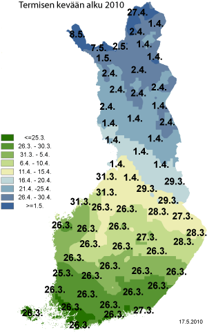 Tässä Sääbriefing-sivustolta linkitetty kuva viime kevään alkamisen päivämääristä