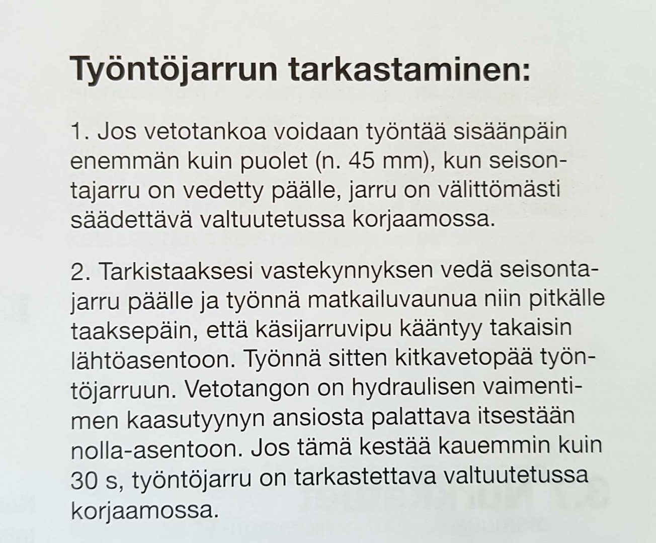 Vanha aihe mutten uuttakaan viitsi aloittaa.. Hoppyn aisajarrua testailin ja käsin työntämällä sitä ei saa liikkumaan sisälle kuin muutaman millin, oli jarru päällä tai ei. Lieneekö normaalia? Hobbyn manuaalissa aisajarrun toiminta tarkistetaan seuraavasti:  Aika vaikeaselkoisesti esitetty, eli käsijarru kiinni ja vaunua työnnetään taaksepäin kunnes käsijarru menee nolla asentoon. Tämän jälkeen lykätään kitkavetopää kiinni työntöjarruun..?? Onnistunee ainoastaan vaunu auton koukkuun kiinni ja pakittamalla kässäri päällä, tosin veikkaan, että saattaa tulla asiaa korjaamolle.. Mitähän Hobbyn insinöörit ovat tarkoittaneet? Onko suomennus mennyt hiukan pipariksi vaiko oma ymmärrys ei vaan riitä