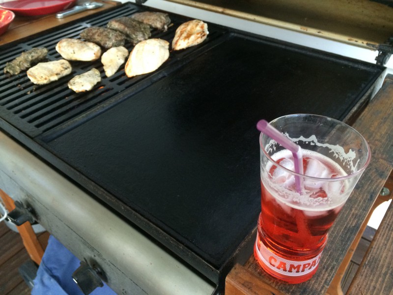 Kippistä itelles! Camparisodat kaadoin ja siirryin grilliosastolle. Kanaa ja lammasta.