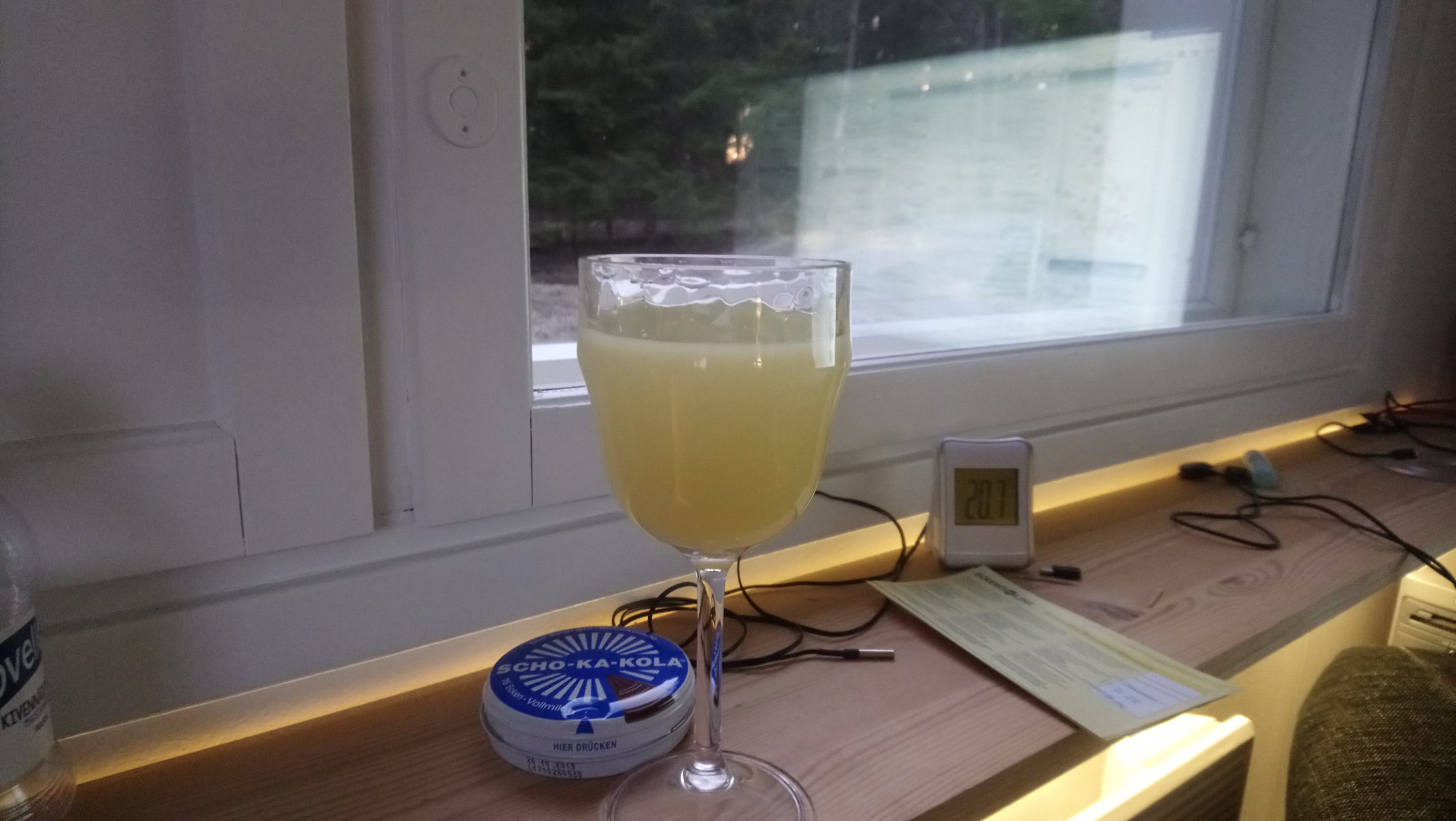 Saunan päälle, koskenkorva, tuoremehu, sitruunajuoma ja kivennäisvesi rinkki isoon lasiin.  :D