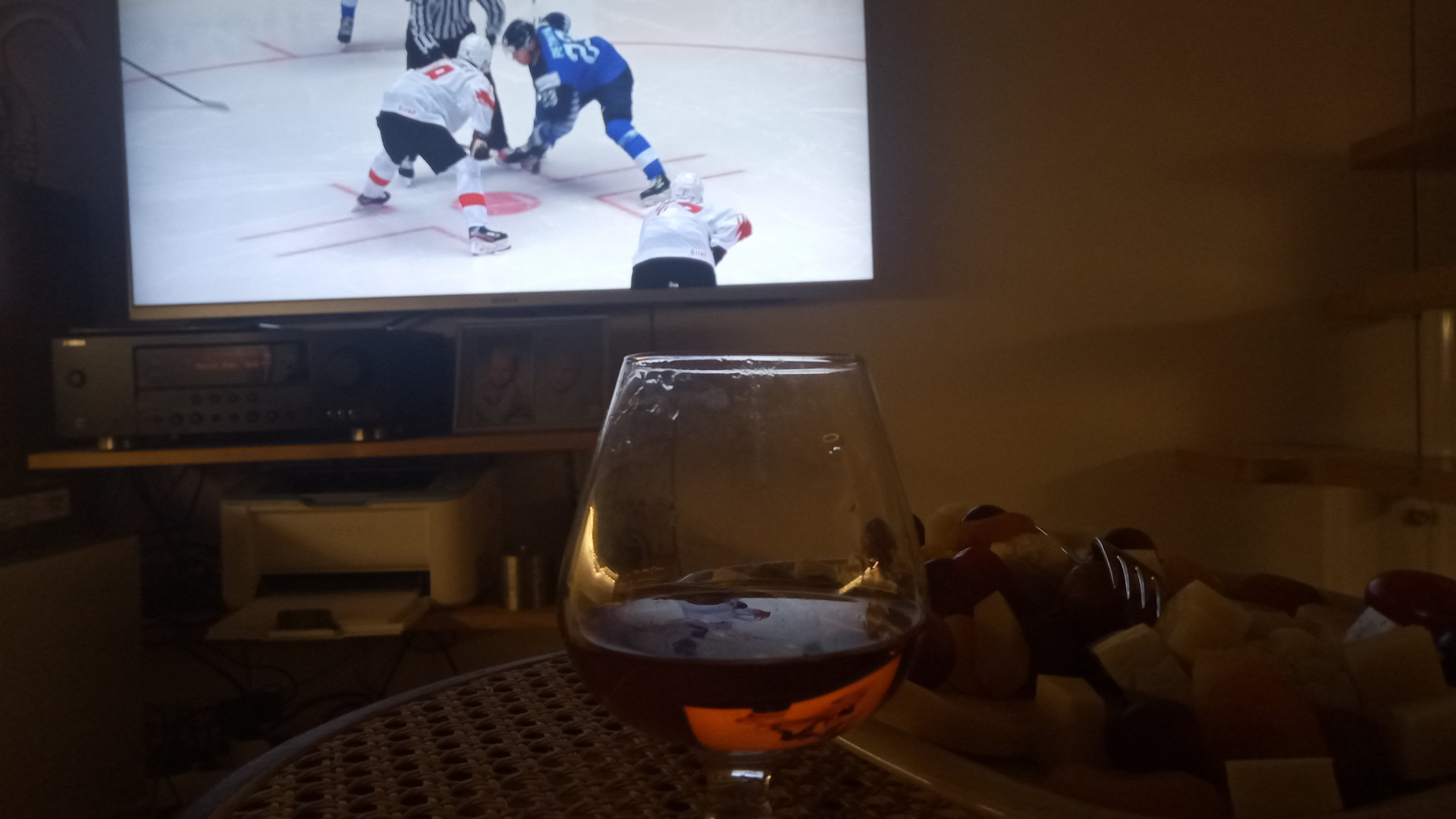 Selkä on niin jumissa ettei tahdo liikkumaan päästä mut onneksi makuuasennossa voi katsoa jääkiekkoa ja ryystää ruskeaa juomaa