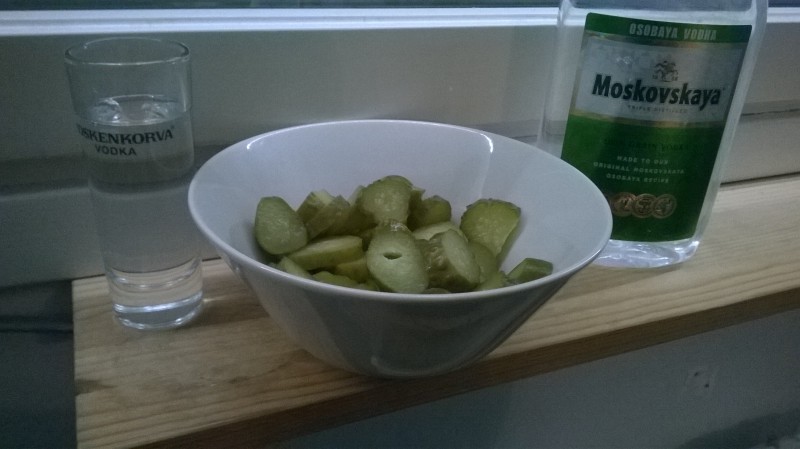 Olisi suolakurkkua, hunajaa ja turkkilaista jugurttia. Vaan ei ole kun Belugaa, ja niitä ei nyt malta ruveta aukomaan. :)