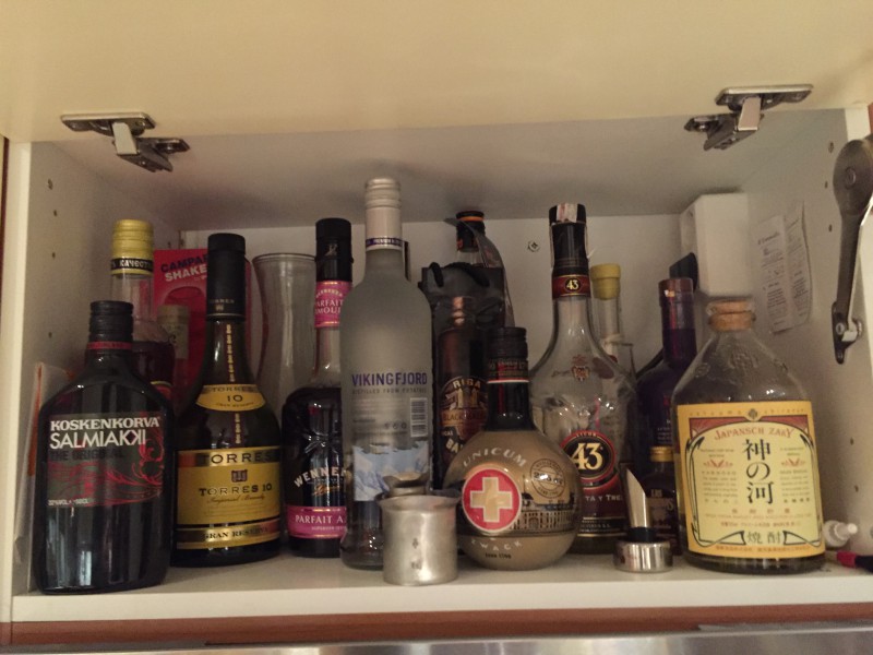 Tuosta baarikaapista voi valita, meinaa vajentua niin penteleen hitaasti. Viskit, konjakit ja gin on toisessa kaapissa, amarot ja Campari kylmässä.