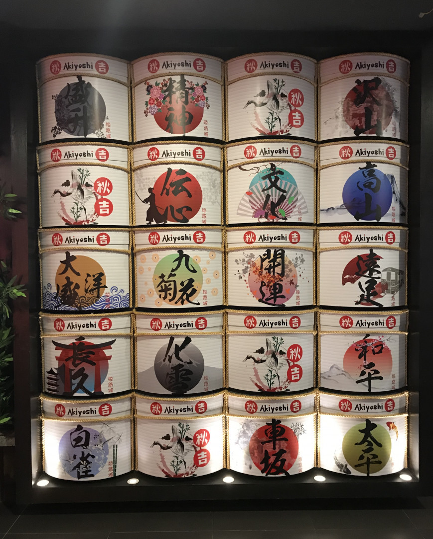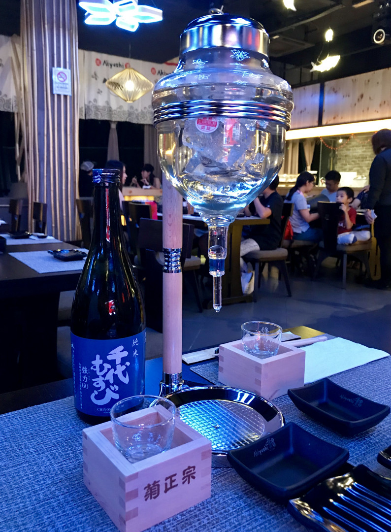 Kun en ole asiantuntija, niin saken ostaminen on aina arpapeliä. Eilen oli hyvä tuuri. Sake kaadettiin tuohon kokolasiseen automaattiin, josta lasin täyttö nostamalla venttiiliä ylöspäin. Säiliön sisällä on suljettu jääsäiliö, jonka tarjoilija kävi välillä vaihtamassa. Ruoka tietenkin hemmetin hyvää, kuin olisi Japanissa ollut.