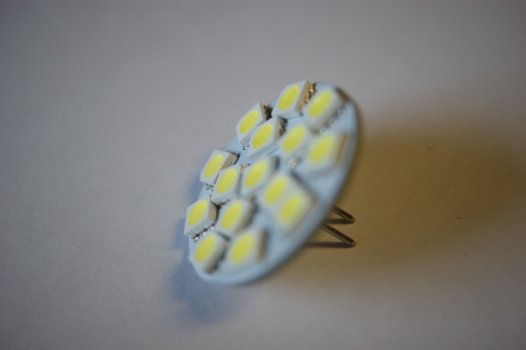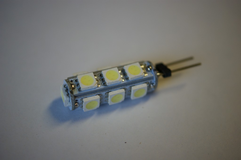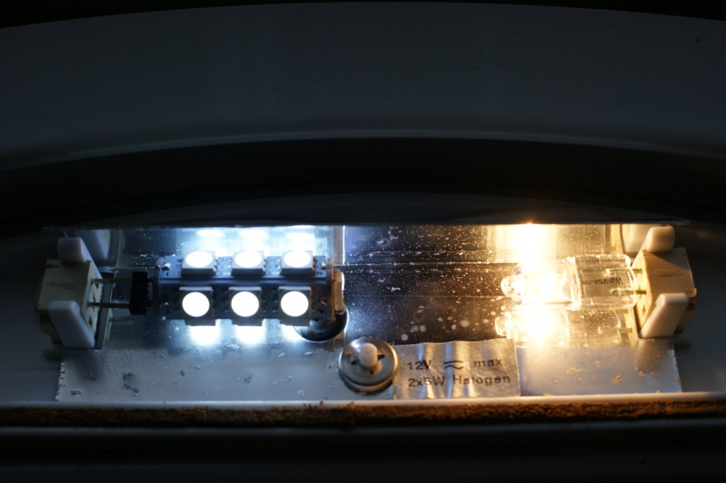 Pikkuisessa retkeilyvaunussani on valaisimet toteutettu halogeenipolttimin. Yleisvalaisin katossa pöydän päällä 3x10W, seinävalaisin WC:ssä 3x10W ja takakeittiö 2 kpl 10W.