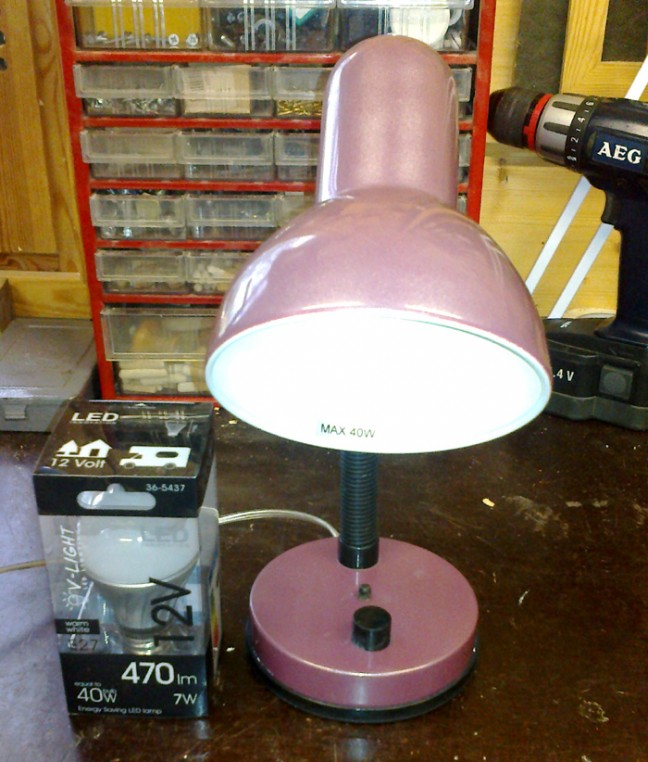 Vaihdoin tilalle "itävirityksellä" 40 W / 12 V halogenin. Sillä näkee sohvapöydän ääressä lukea hyvin.