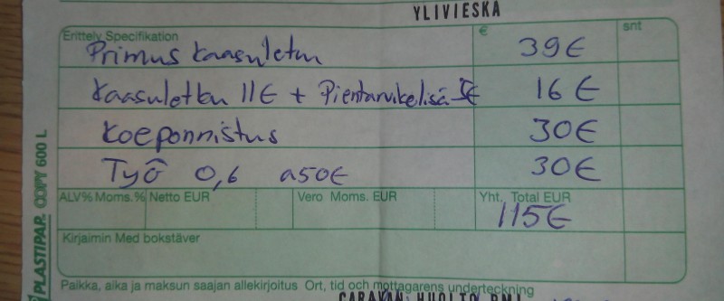 Tarkoitatko, että Primus sovittaa alkuperäisosassaan 4.8 mm sisähalkaisijaltaan olevan letkun 10 mm nipalle? Niin ja pienenä lisäyksenä. Ei kysymys ole pelkästään hinnasta. Ei kai kukaan harrasta vaunuilua, mikäli homma on neljästäkympistä kiinni. Kysymys on järjestä. Ilman perusteltua syytä lienee järjetöntä tilata kokonaista kaukomailla kasattua letkua, mikäli omasta tallista löytyy hyväksyttyä letkua vuodelta 2014 ja uusia hapokkaita kierrenippoja. Minkä ikäistä letkua alkuperäiset ovat tällä hetkellä? Onko kaukomaan puristusnippakoneen käyttäjä niin taitava, että turvallisuus nousee?