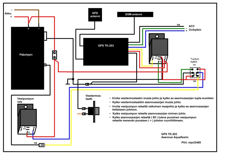 Kytketään vesitermostaatin johdon väliin. Kuvassa on TK103, joudut tekemäänvesipumpull e myös kytkimen kuvan mukaisesti.    Tämä on alkuperäinen kytkentä. Muuta toi otsikko "Aquaflex kaukokäinnistys", jos viitsit.