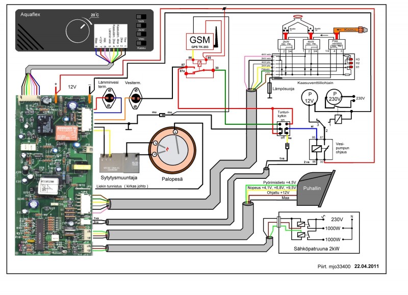 Talvikausipaikka olisi hommattu ja pitäisi keksiä kaukokäynnistys aquaflexille. Minulle riittäisi että puhelimella saa sähkölämmityksen päälle, eli helpointa on ostaa tuo verkkokaupan gsm pistorasia. Tällä saa sähkövastukset päälle, mutta ongelma on tuo 12v kiertovesipumppu, se kun jäisi sitten pyörimään itsekseen. Onko tämä mjo:n tunturikytkentä, sellainen että se laittaa pumpun pyörimään, kun gsm pistorasia laittaa sähköt päälle ja kytketäänkö se ohjauspaneelilta pääpiirikortille tulevan punaisen johdon väliin?