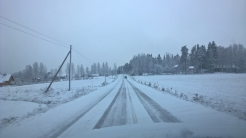 Olipa mukava huristella talvirenkailla kun ei tarvinnut jäädä suvikumiautoilijoid en taakse köröttelemään. Reilu 5 senttiä tullut lunta yön aikana ja lisää tulee.