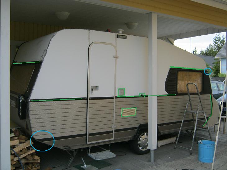 Merkkasin seuraavaan kuvaan sinisellä märät paikat ja vihreällä jo läpikäydyt paikat: