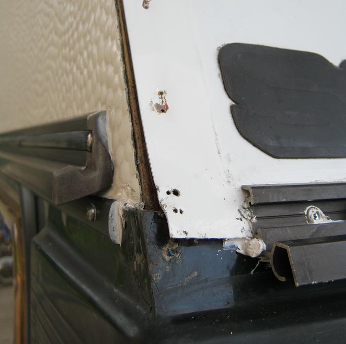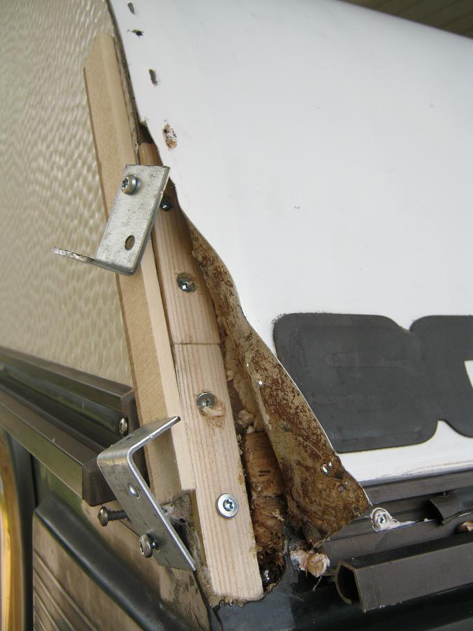 Raosta ujuttamalla sai kahteen osaan vinottain sahatun korjausriman palan paikoilleen ja muutamalla ruuvilla ja uretaaniliimalla kiinni. Mustan kulmamuovin yläreunan korjasin epoksilla. Nyt saa ruuvit kiinni terveeseen puuhun ja lahot poistettu. Kuvassa kulmaraudat ja ylimääräinen rimanpätkä liimauspuristimena puristamassa peltiä rimaan kiinni: