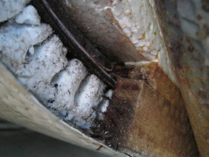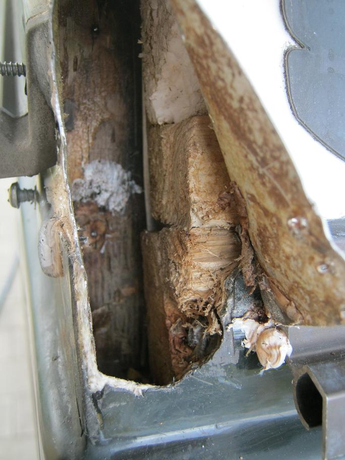 Päätin sitten avata tuon etukulman sen verran mitä peltejä varovasti raottamalla saa. Nurkasta lätyi noin 180mm pitkä riman pätkä, joka oli lahonnut.